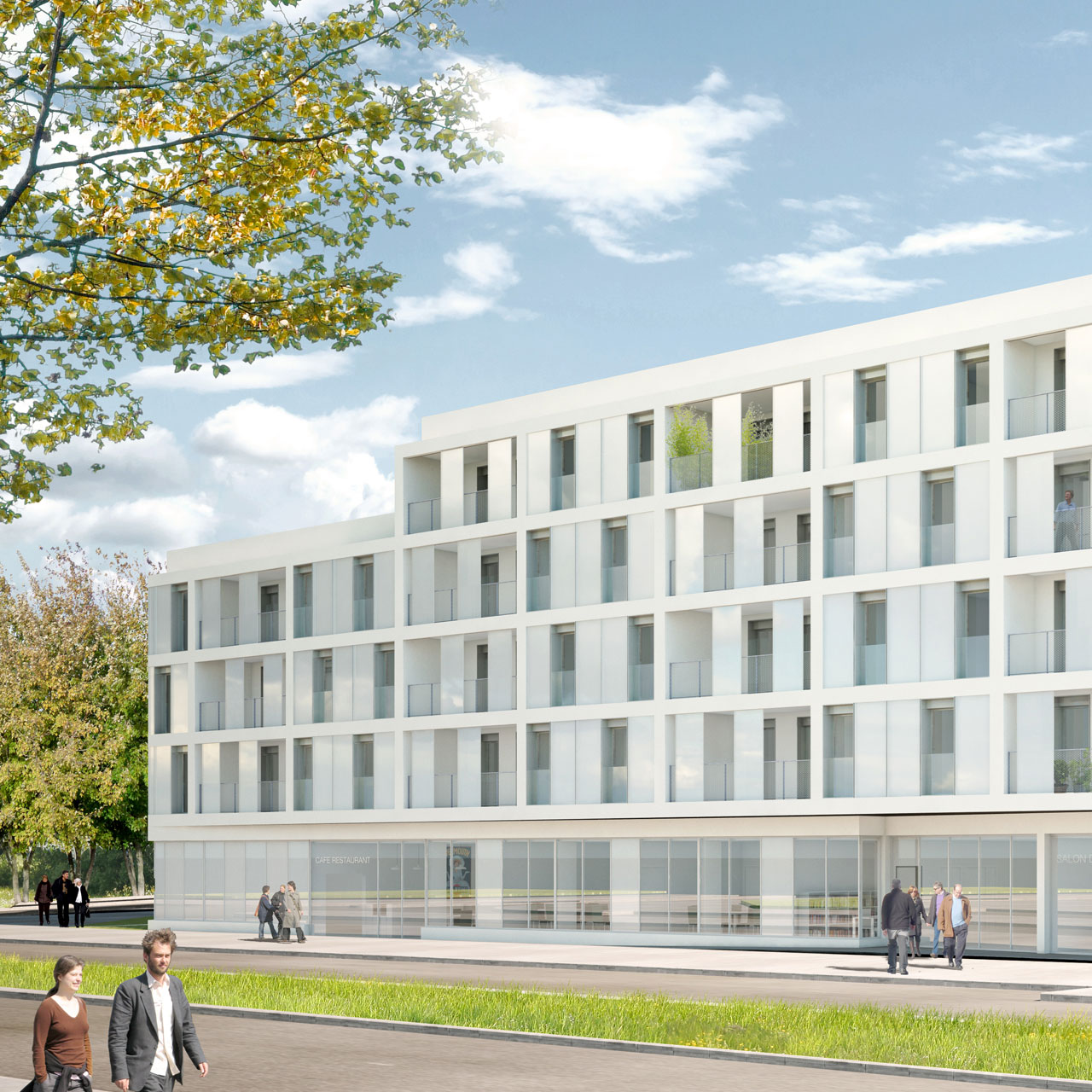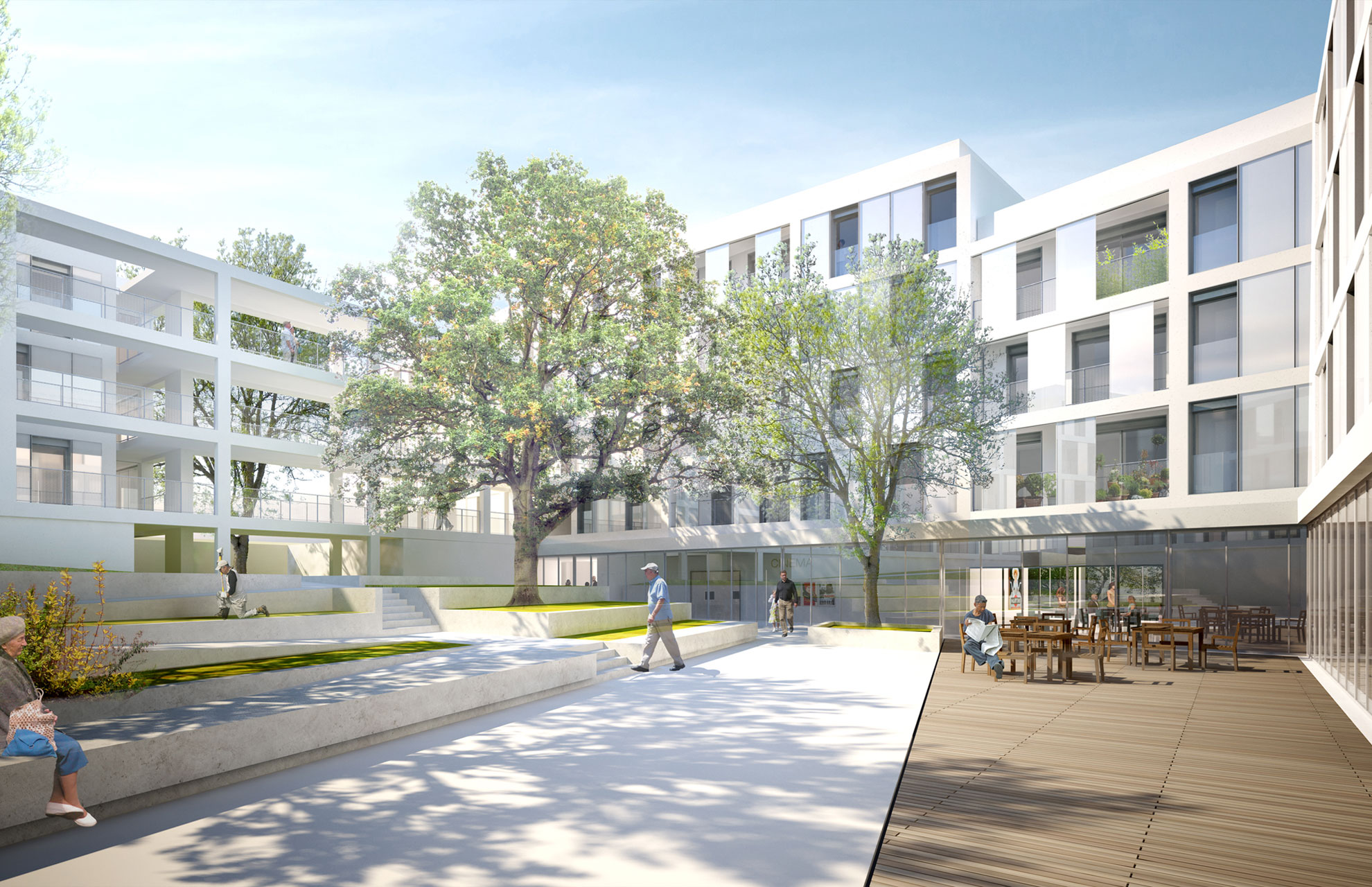 The project unfolds around an interior square in the heart of the block in order to create a space for sharing; the elderly can find themselves in an intermediary place, between private and public space. The facades and common areas are designed as breathing spaces. The building is developed on the basis of a square, one of whose vertices remains open, allowing the garden to escape from its enclosure. A set of panels on the facade offers staggered outdoor spaces, which gives the building a noble status that establishes it as an urban entity, thus going beyond the vision of a building of report.