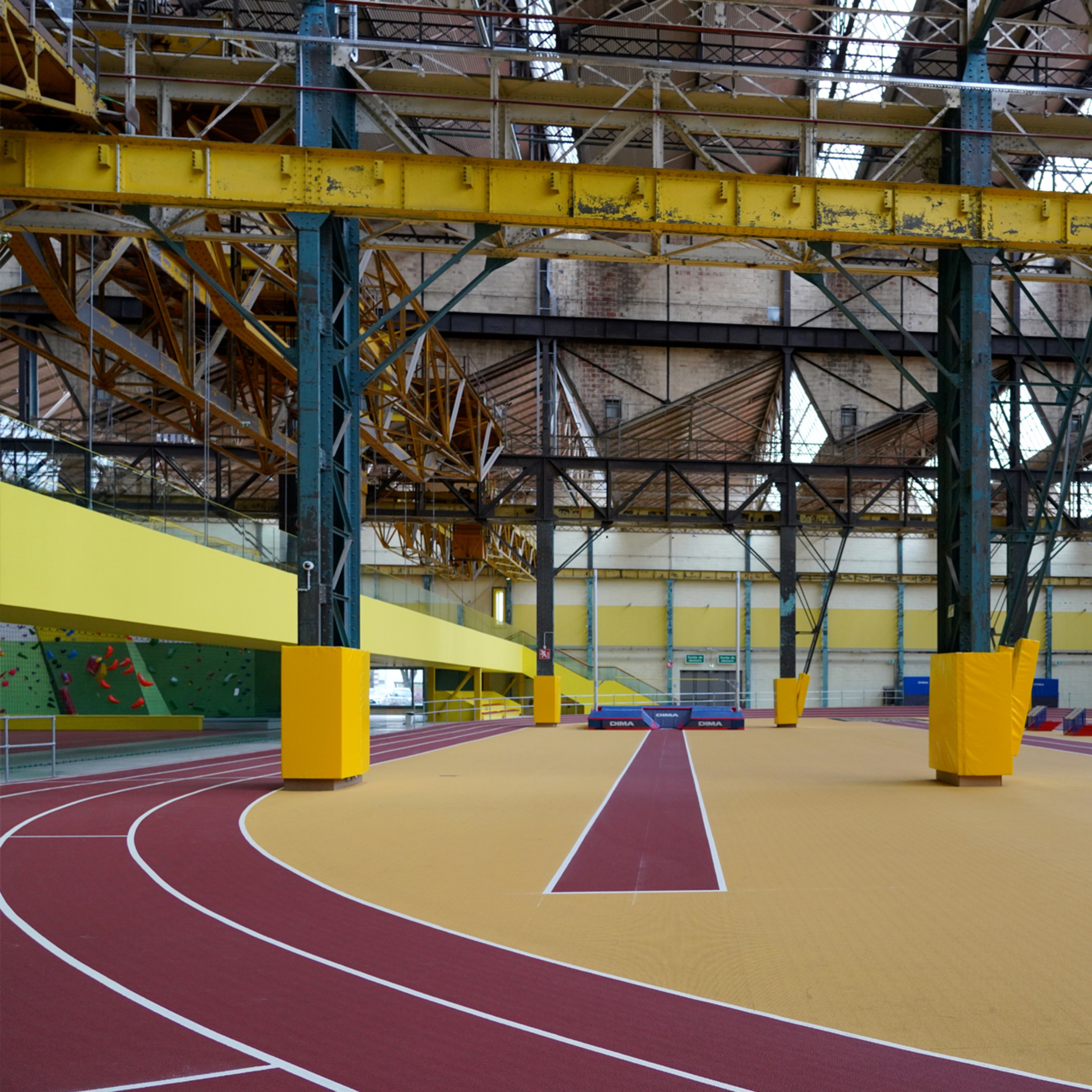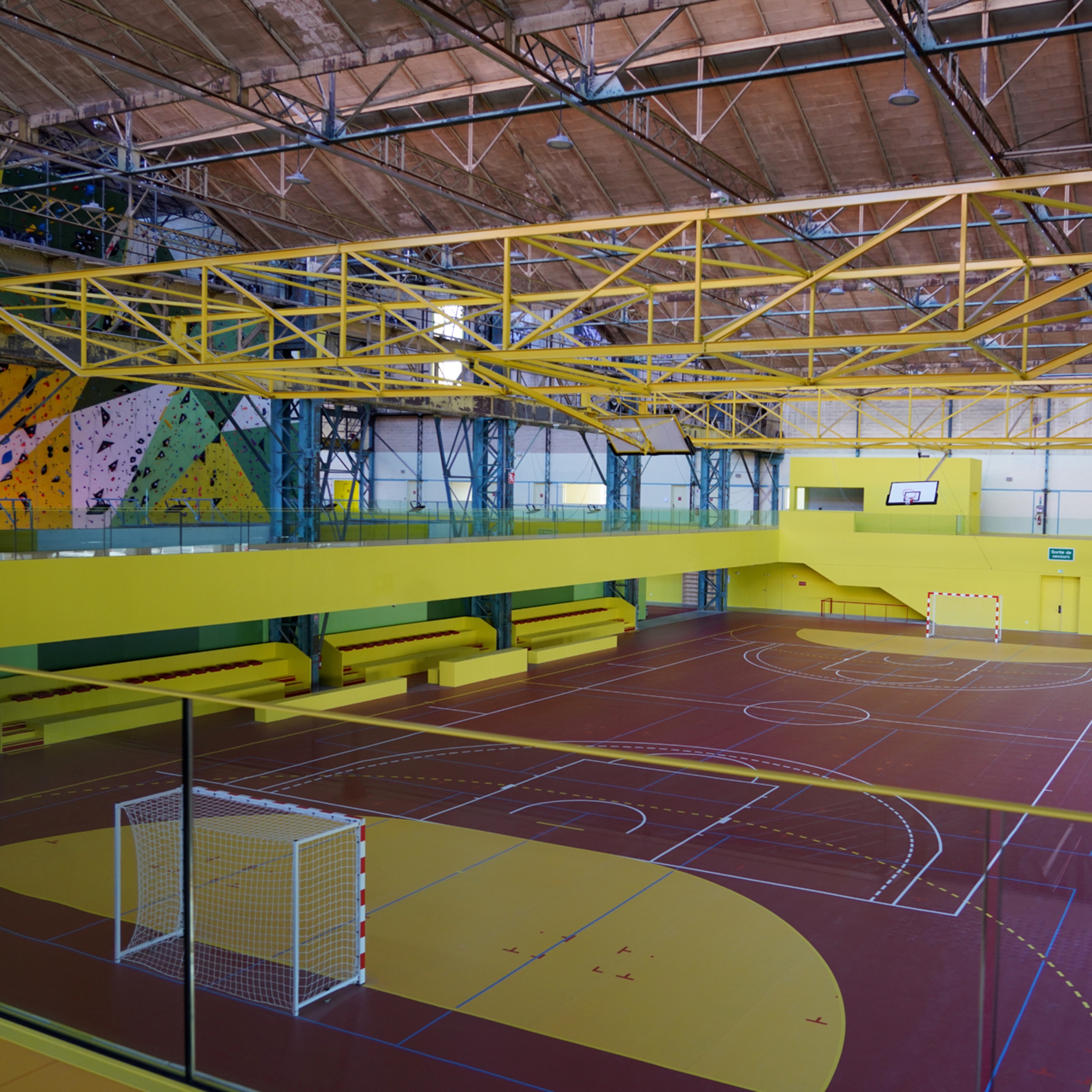 On the ground floor there are two axes: the horizontal axis South-East/South-West in relation to the forecourt and another perpendicular axis North/South on which the sports activities are developed. The horizontal axis unfolds according to the principle of walking forward, from the entrance to the sports hall. It extends over all the services allowing the future sports users, members of associations and spectators to get into condition. The airlock leads directly into the entrance hall, which is visually open to the second axis devoted to sports activities, with a direct view of the sports hall and the athletics track.