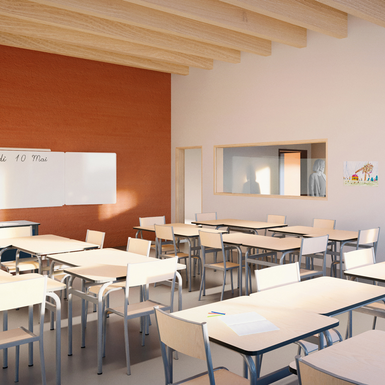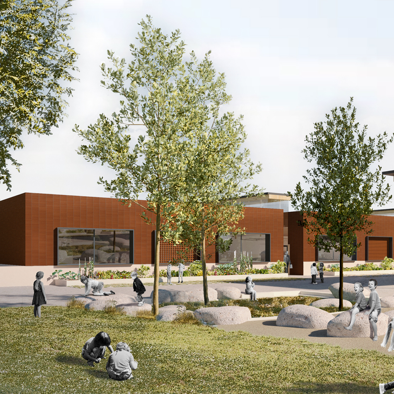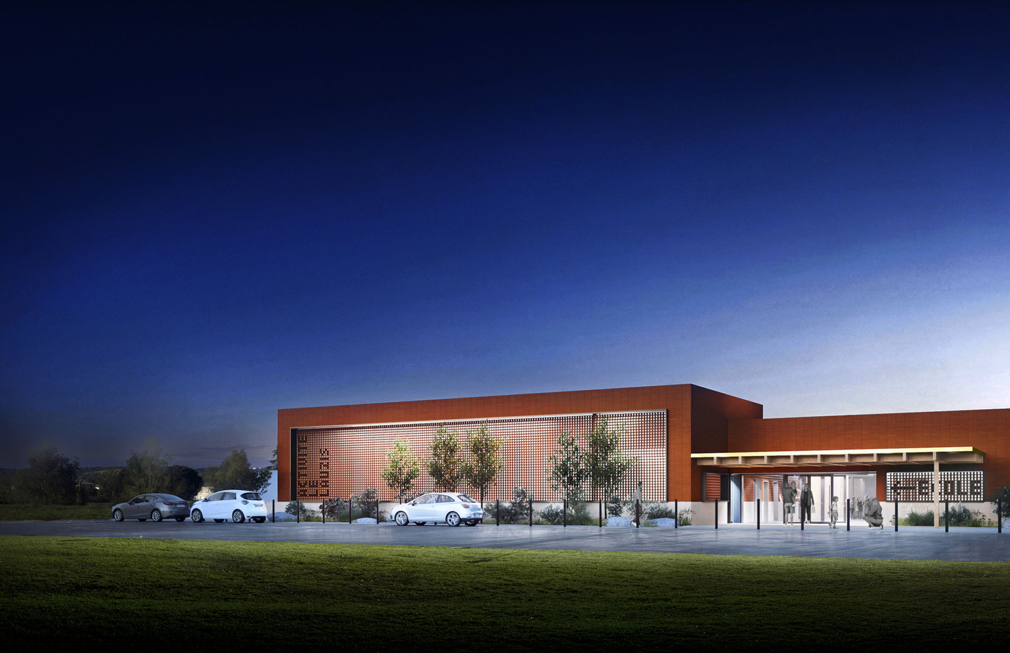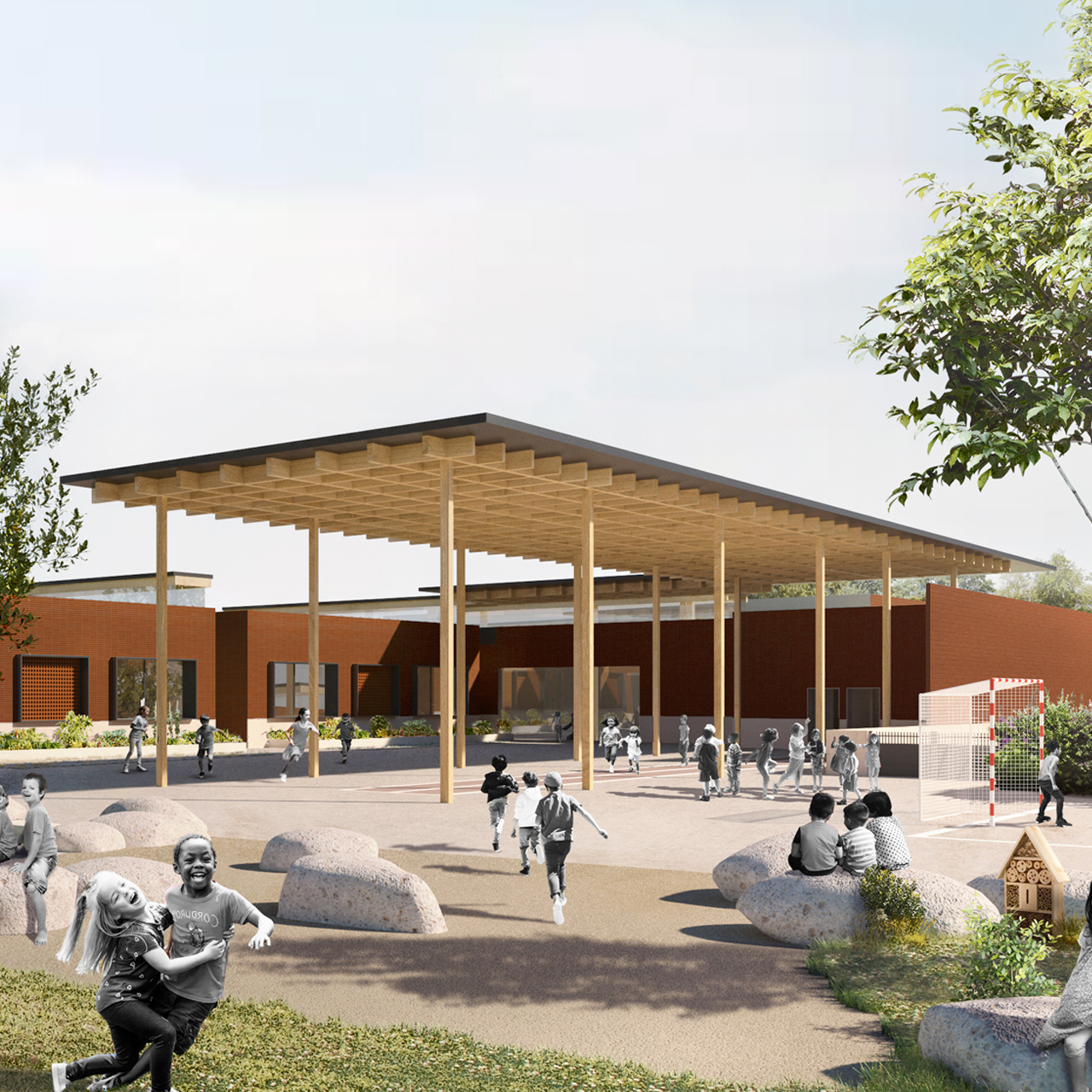Le projet met en avant dans un premier temps la noue en la sécurisant pour les enfants et évitant d’être clôturé. Cet espace accueille un aménagement paysagé avec un fort lien évocateur de la nature en prolongement du pré existant. La lecture du bâtiment se fait par un volume jumeau marqué par un parvis commun avec un auvent en débord sur l’esplanade pour orchestrer une double entrée, celle de l’école et la salle multiactivités. Une signalétique inscrite dans la façade oriente les utilisateurs vers leur lieu de destination pour organiser une circulation piétonne différenciée. À l’intérieur des murs en terre crue permettent de garder de la fraîcheur. La cour de récréation s’articulant sur un îlot rafraîchissant, dans l’axe du préau.