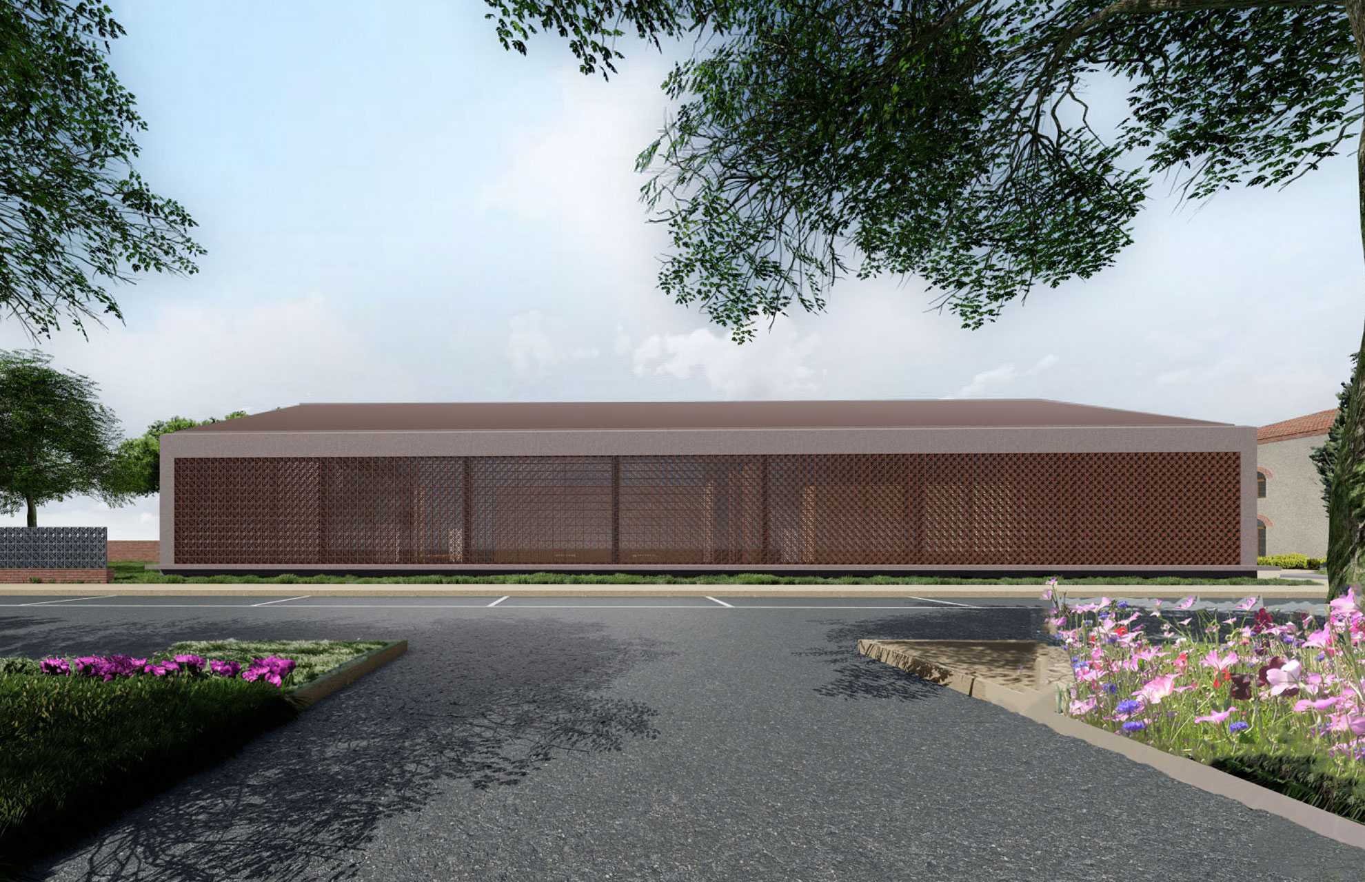 La requalification des typologies d’espaces et la nécessaire densification engagent des mouvements fonciers importants ; ceci se traduit au sein du PLUiH par une Orientation d’Aménagement Programmé (OAP) pour un projet d’application traité par un cabinet d’urbanisme sur l’ensemble du périmètre. Une charte des matériaux est définie pour l’ensemble de l’opération. Dans ce cadre, l’une des premières opérations structurantes à mener réside dans la création d’un nouveau foyer, à l'arrière du presbytère, afin de libérer l’espace occupé par le bâtiment actuel. Un terrain de 17 mètres sur 80 doit inclure l’articulation d’un cheminement induit par la requalification urbaine, imposant à ce bâtiment de 420 m2 la dotation d’une double entrée. Le projet est conçu sur une ligne reliant la partie Ouest piétonne et la partie Est. Selon cette ligne se déploient, d’un côté, les locaux de service et, de l’autre, les trois salles d’activités. Un seul volume vient englober l’ensemble. Ce volume massif, aux doubles parois isolées, en béton ocre, permet de répondre aux problématiques thermiques, tel l'usage de vieux murs ancestraux gardant la chaleur en hiver et la fraîcheur en été. Sur la façade Nord-Ouest, une large ouverture se pose sur le domaine public. Un voile d’éléments en terre cuite dessiné par l’agence dans le cadre de son programme de valorisation de la terre cuite toulousaine adoucit le caractère robuste du foyer rural.