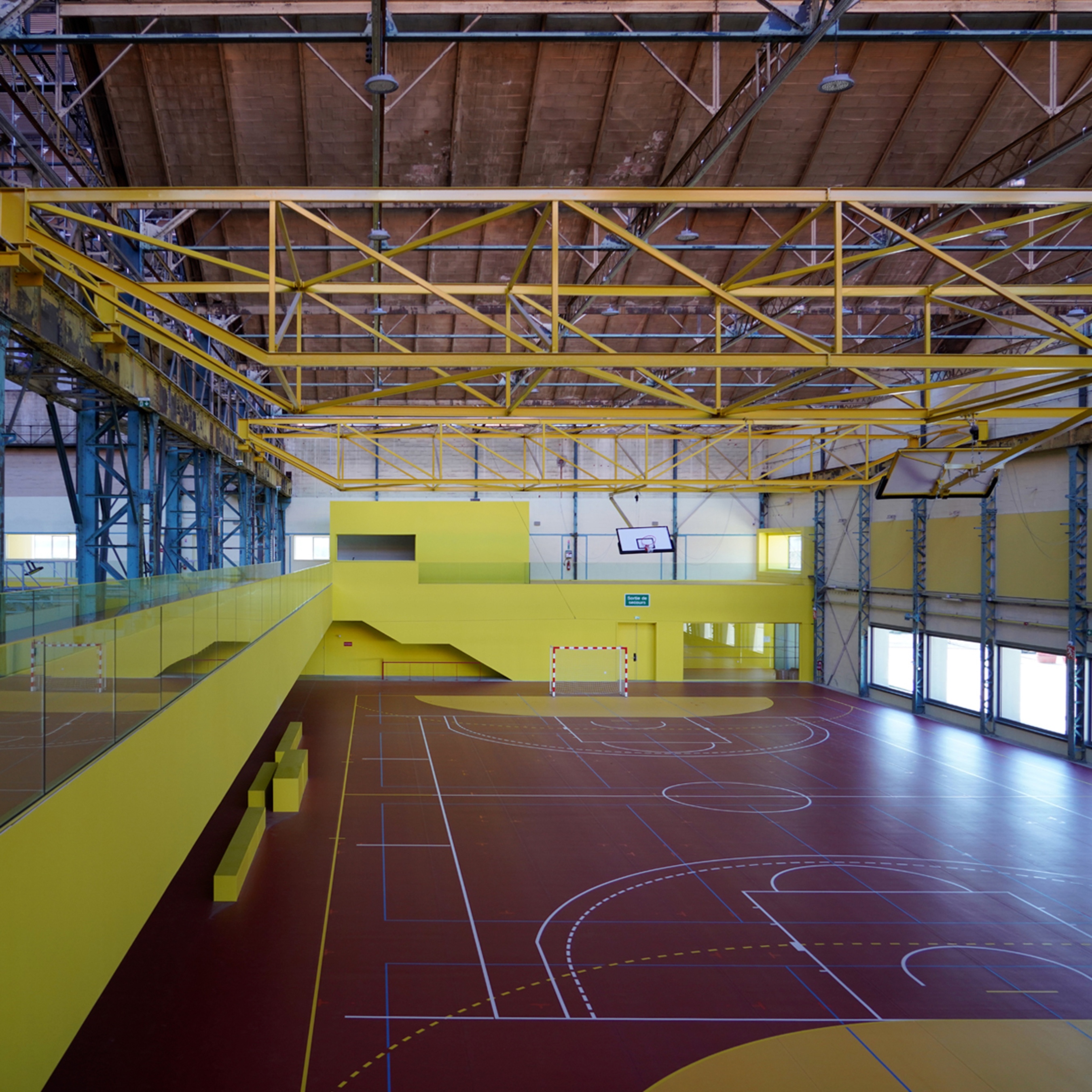 Au rez-de-chaussée se développent deux axes : l’axe horizontal Sud-Est/Sud-Ouest en relation avec le parvis et un autre perpendiculaire Nord/Sud sur lequel se développent les activités sportives. L'axe horizontal se déroule selon le principe de la marche en avant, de l'entrée jusqu'à la salle de sport. Il se déploie sur l'ensemble des services permettant la mise en condition des futurs utilisateurs sportifs, des membres des associations et des spectateurs. Le sas débouche directement sur le hall d'entrée, visuellement ouvert vers le second axe consacré aux activités sportives, avec une vue directe sur la halle de sport et la piste d’athlétisme.