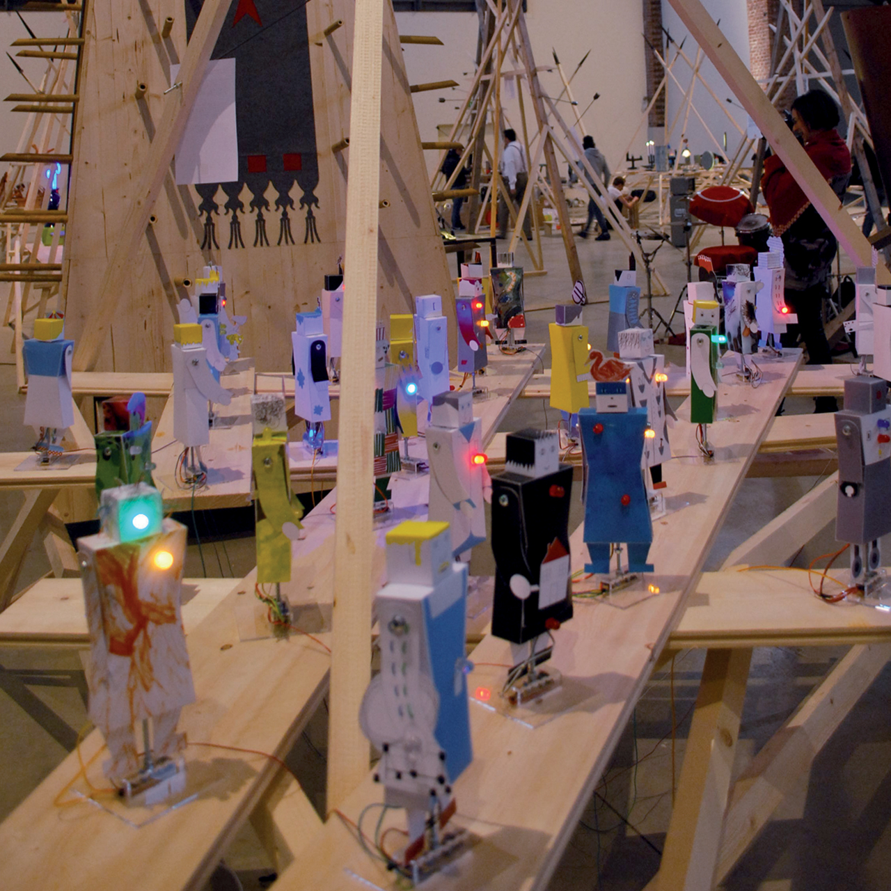 Dessiner leurs rêves, produire des objets en soutien à leurs pratiques. Ils n’achètent plus seulement des objets de représentation. L’armée est faite de Robots pour les enfants, faits à partir de dessins d’enfants, pour qu’ils apprennent à faire : montages, programmes, dessins, échanges d’idées. Tête et bras peuvent être échangés, ils bougent, il y a des LEDs… Les enfants peuvent dessiner leurs modèles.