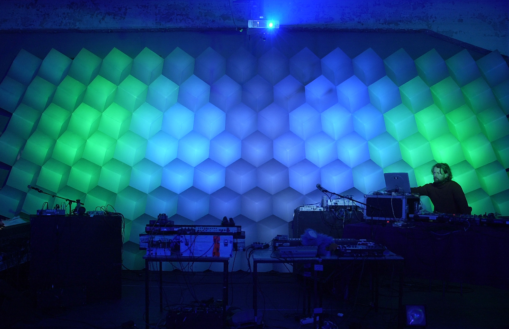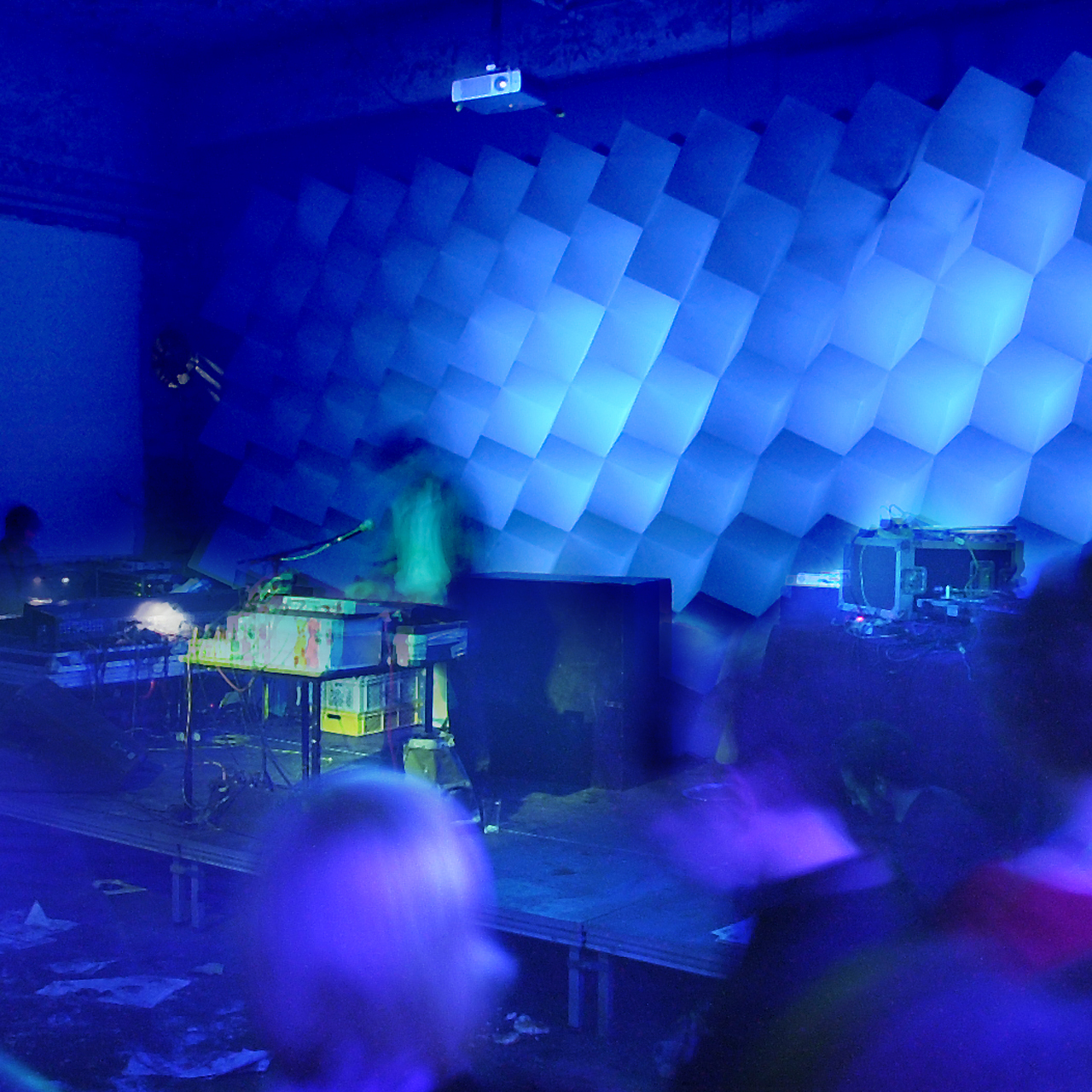 Penser et utiliser dans le cadre du Club Maria de la Transmédiale à Berlin, il est recouvert d’une peinture argentée qui reflète la lumière et donne un jeu de profondeur variable suivant les angles de projection.
