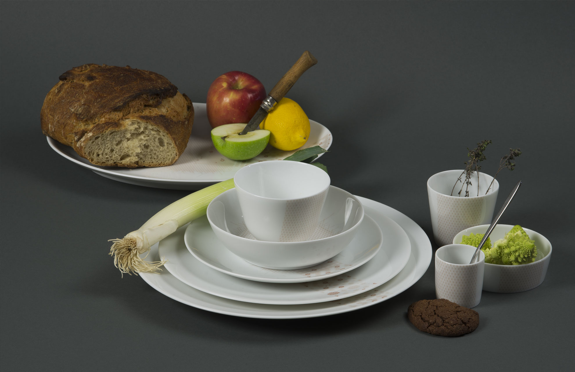 Assiettes, plats, tasses sont imaginés comme support d’appropriation par la décoration. Le service est issu d’une production artisanale de porcelaine de Limoges. Sur la base d’une trame, la A1, qui joue comme un élément de composition, se structure de motifs. D'autres peuvent venir être apposés facilement sur ces repères par différentes personnes : artiste, designer, artisan…